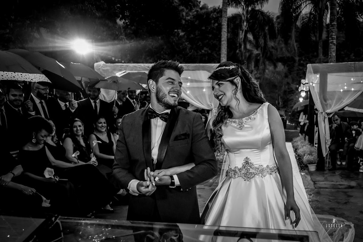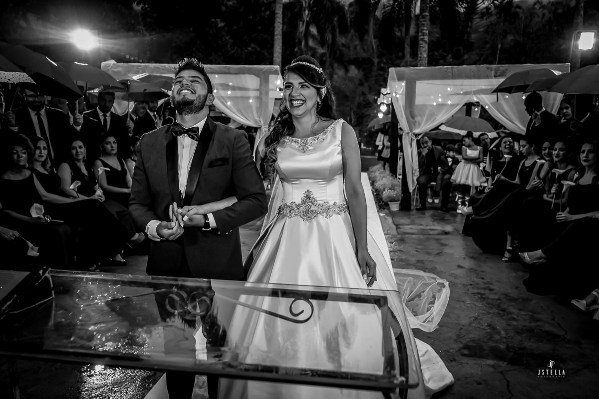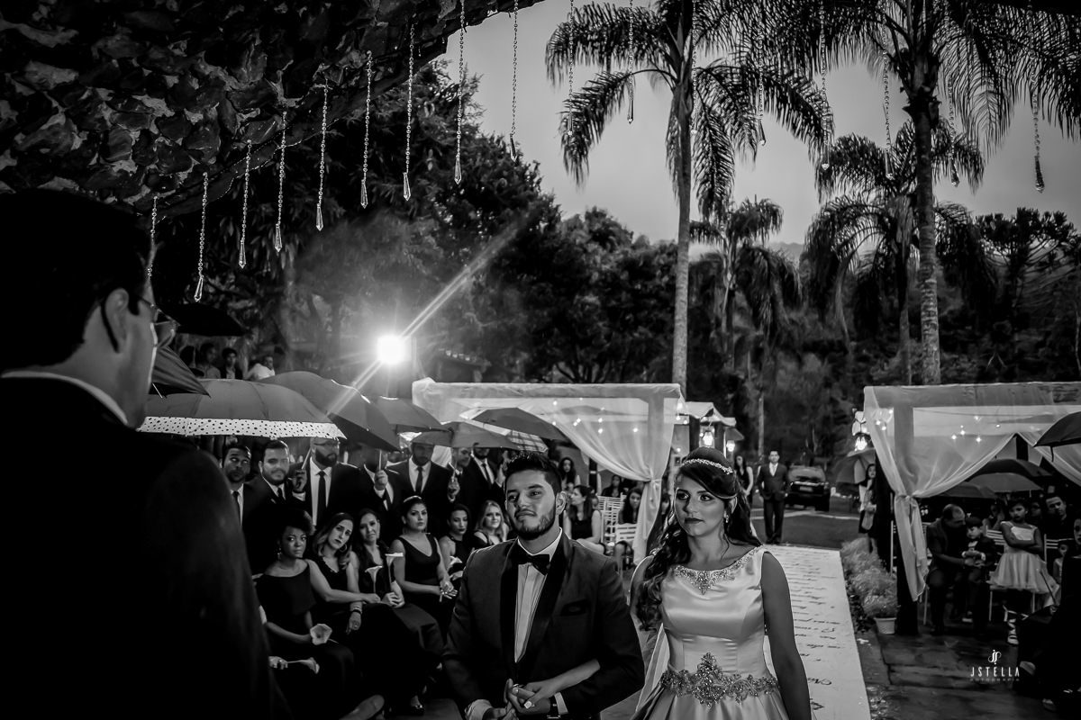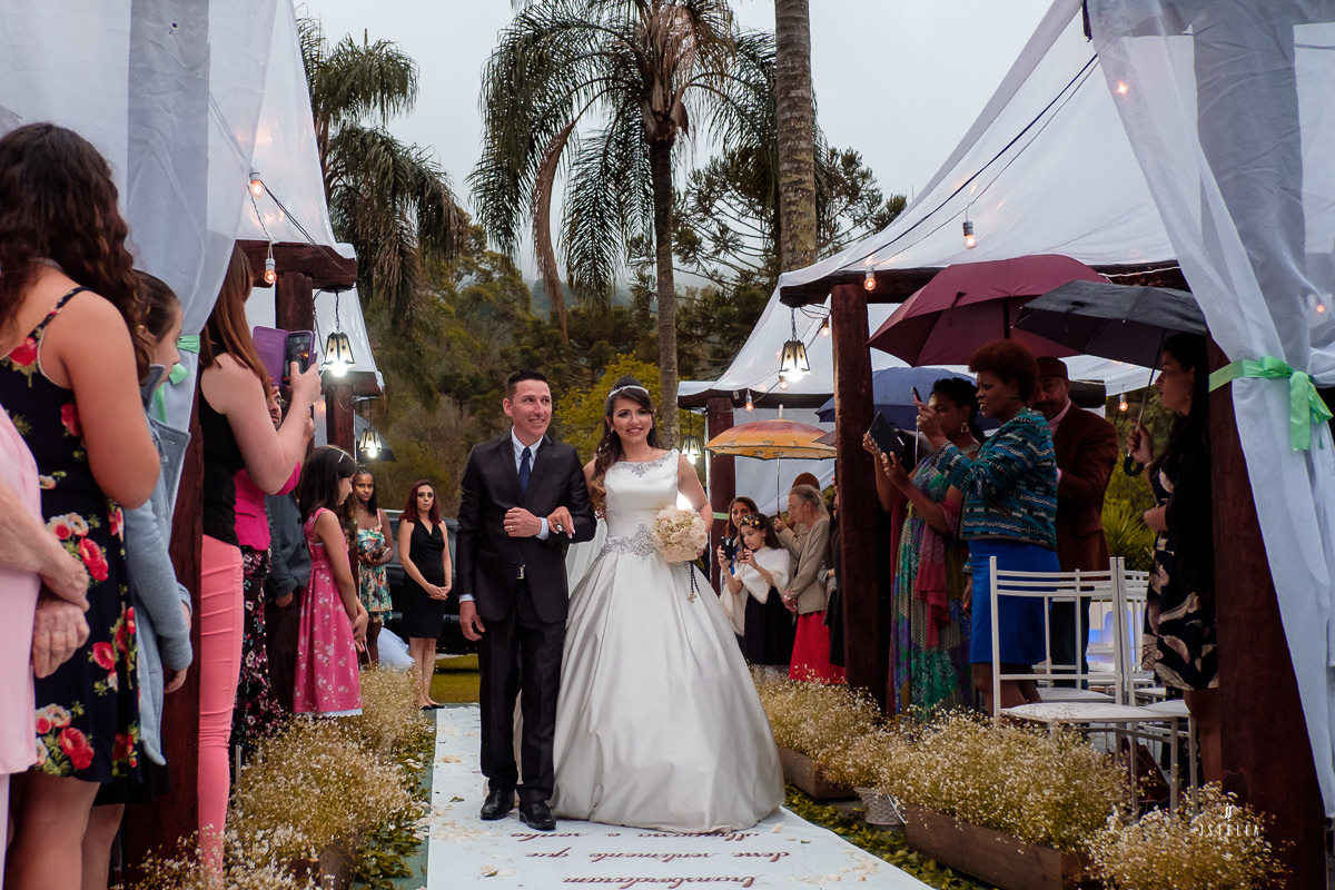 Nossa equipe chegou embaixo de garoa forte e, no espaço e não tinha como não ficar apreensivo, pois estava chegando a hora da cerimônia e a chuva não havia dado trégua, foi onde a Keila me falou que se a chuva não parasse tudo bem, mesmo que os convidados ficassem no espaço da festa onde havia cobertura, ele, os noivos, iriam entrar sobre o tempo que tivesse, com chuva ou sem chuva!